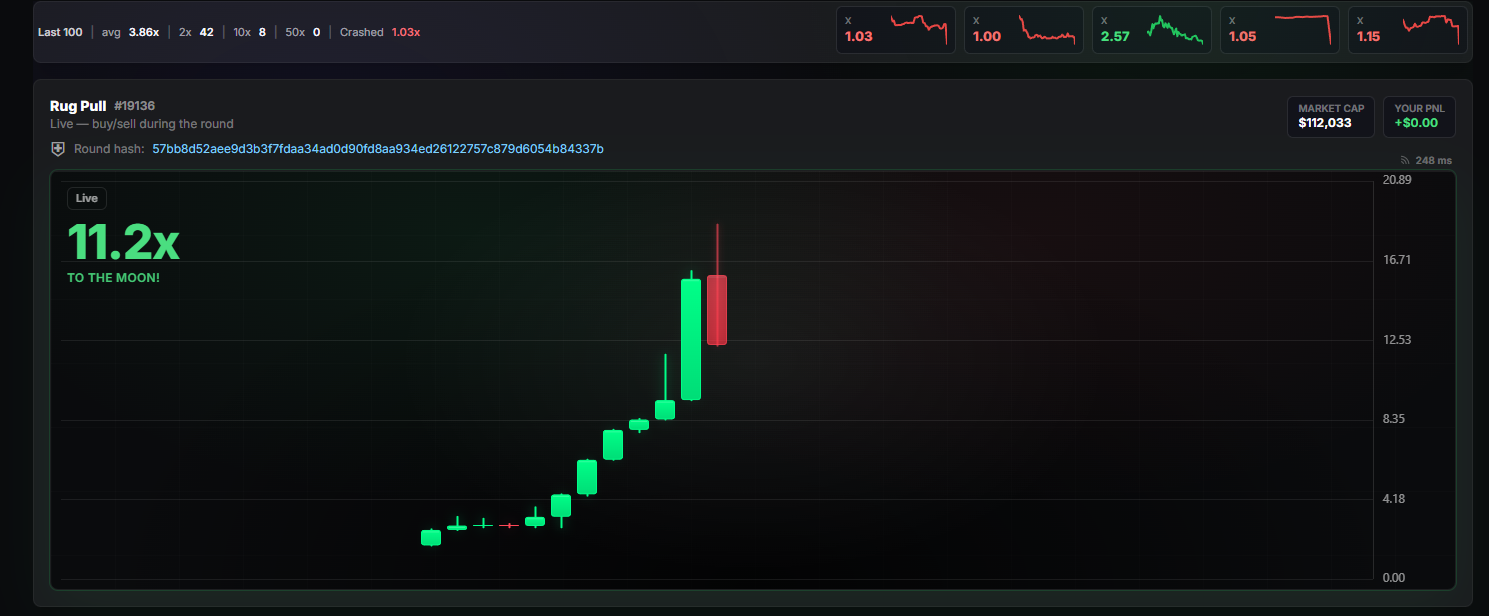 RUG PULL MODE: Live betting during the round! Buy/sell in real-time as the multiplier moves. Will you cash out early or ride it "to the moon"?